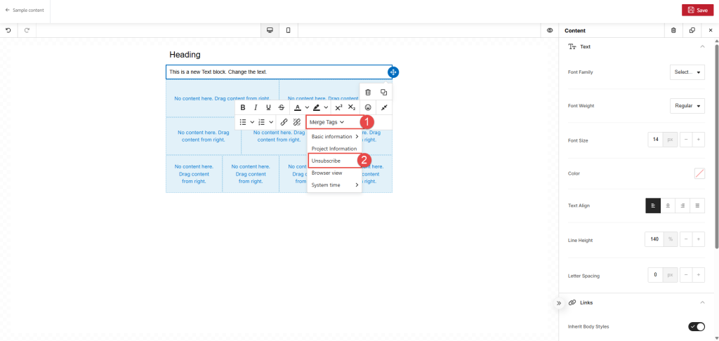 To add an Unsubscribe link, first click on "Merge Tags" (1) then chose "Unsubsribe" (2)
