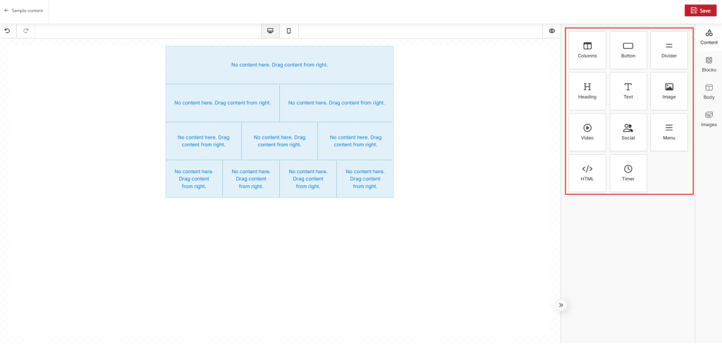 - Drag and Drop Builder – Design an email by dragging and dropping content blocks (recommended for best responsiveness).