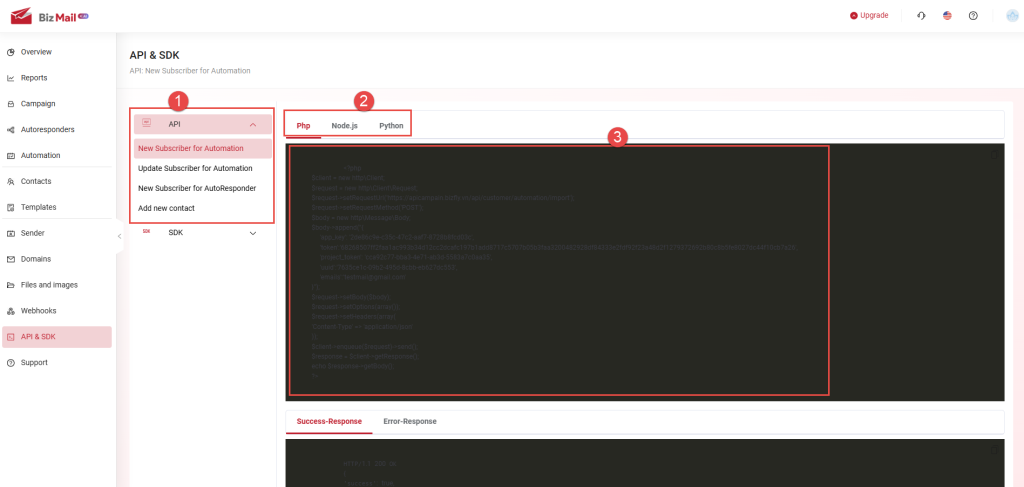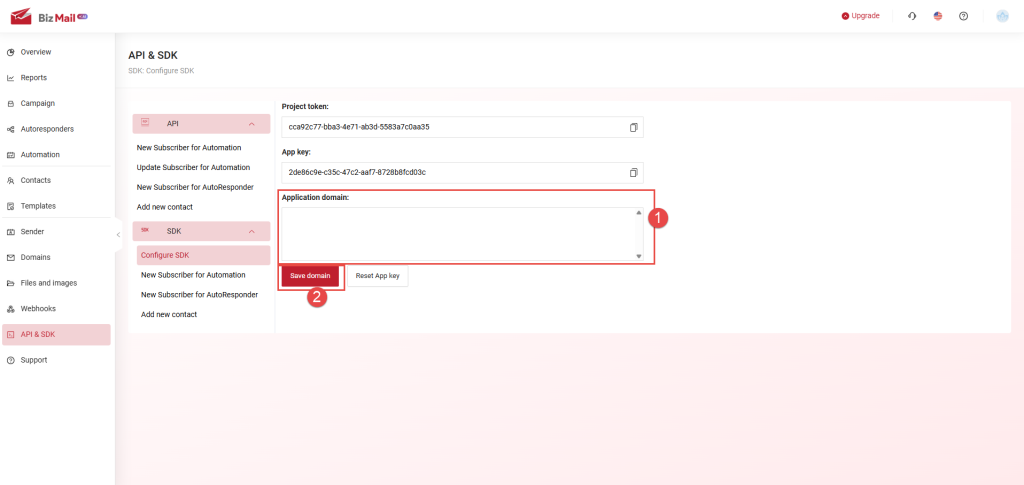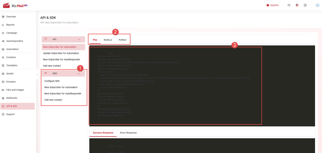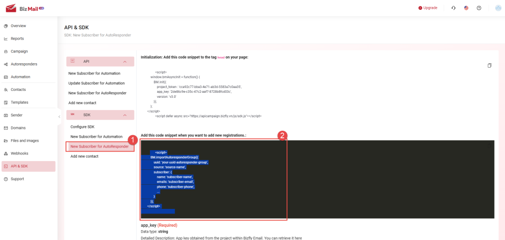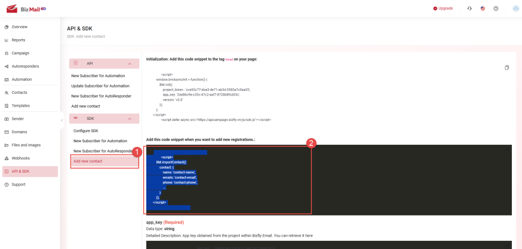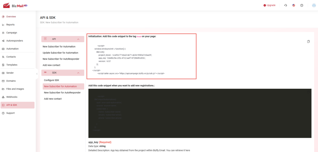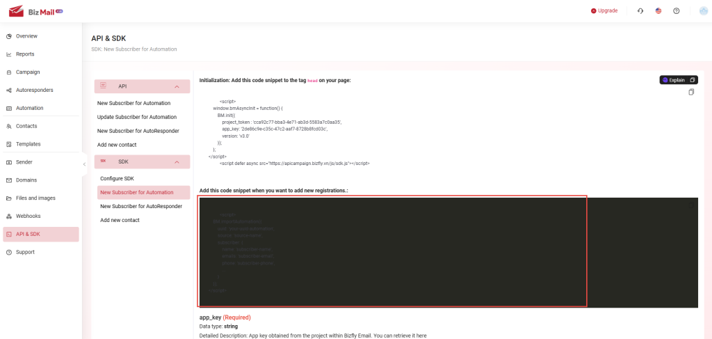 API & SDK are features that allow users to retrieve customer information data from their website/application into the BizMail software in order to perform specific actions on the platform. The API is used for backend integration, while the SDK is used for frontend integration.