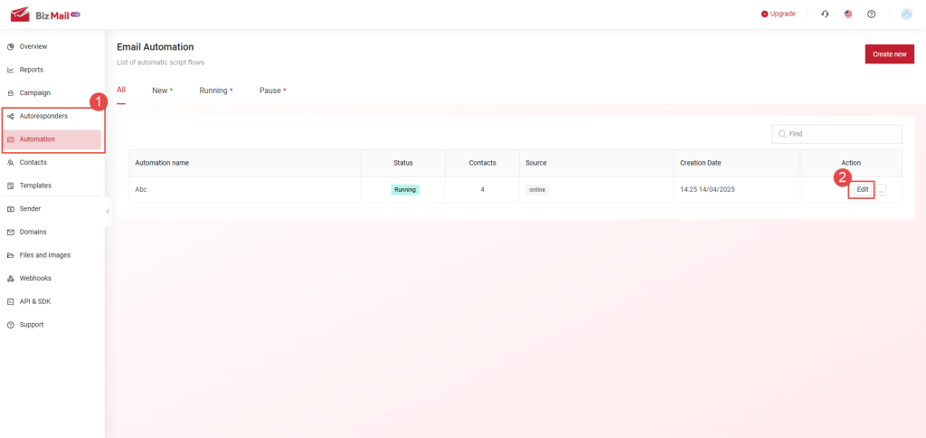 In the Bizfly Email window (see image below), select the feature for which you need the UUID (1), then click Edit (2) corresponding to the scenario you want to handle.
