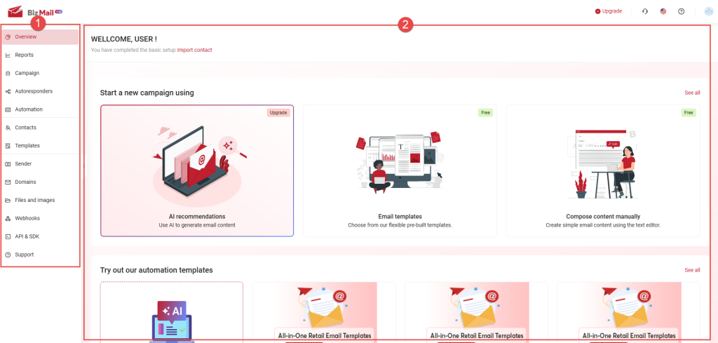 • Left Menu Bar (1): Includes modules for users to set up Email Marketing campaigns.